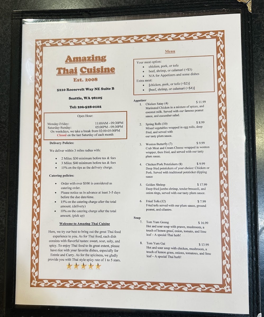 Welcome to Amazing Thai Cuisine, a hidden gem nestled in Seattle at 5210 Roosevelt Way NE. This quaint eatery captivates with its vibrant flavors and welcoming ambiance. The menu boasts an impressive selection of traditional Thai dishes that are sure to please any palate.